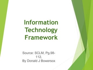 This document provides an overview of information technology frameworks and communication systems used in supply chain management. It discusses four levels of supply chain information system functionality including transaction systems, management control, decision analysis, and strategic planning. It also describes various integrated modules like enterprise resource planning systems, communication applications, and planning and execution systems. Finally, it outlines several communication technologies used in logistics like bar coding, electronic data interchange, radio frequency identification, satellite systems, and image processing.