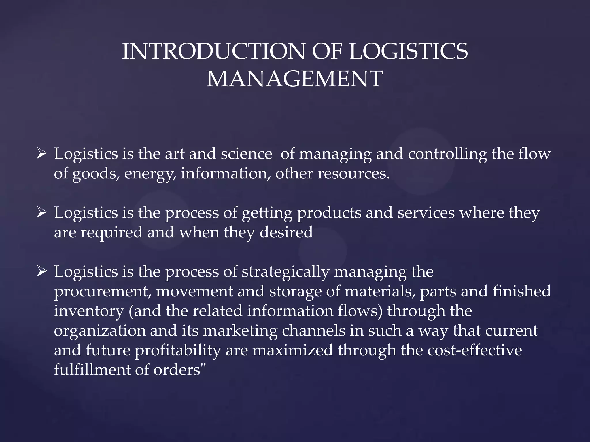 Logistics involves managing the flow of goods and information from suppliers to customers. It includes transportation, warehousing, inventory management, and other processes involved in procurement, distribution, and delivery. The goal of logistics is to deliver the right product to the right customer at the right time and place while minimizing costs and meeting customer requirements. Logistics management aims to control material and information flows efficiently and effectively across the supply chain.