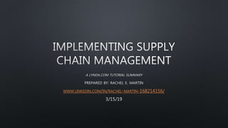 The document outlines the complexities of supply chain management, emphasizing the importance of process frameworks, strategic sourcing, and effective delivery. It addresses challenges such as goal prioritization, risk management, and the necessity of flexibility and visibility, highlighting the role of innovative technologies like AI and blockchain. The conclusion stresses the importance of proper positioning, technology selection, and collaboration in successfully implementing supply chain strategies.