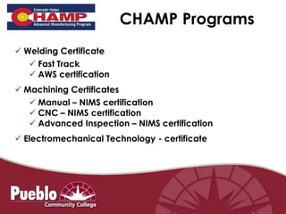 The document discusses updates to CHAMP programs including welding, machining, and electromechanical technology. The programs will start in August and include new hybrid online/in-person options. Welding is full for the fall but recruiting for spring, while machining and electromechanical recruiting is ongoing. Certificates include required courses and potential advisory committee meetings for employer input were discussed.