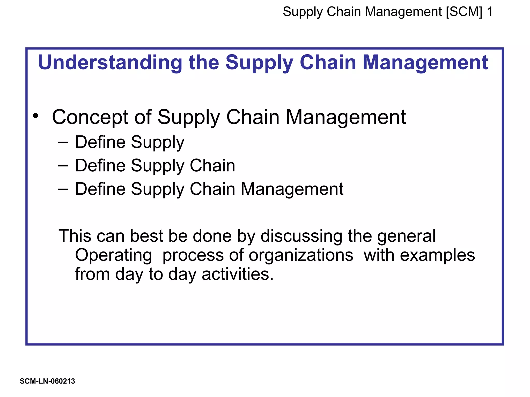 1) It defines supply, supply chain, and supply chain management, explaining they involve the flow of products and services from suppliers to customers.