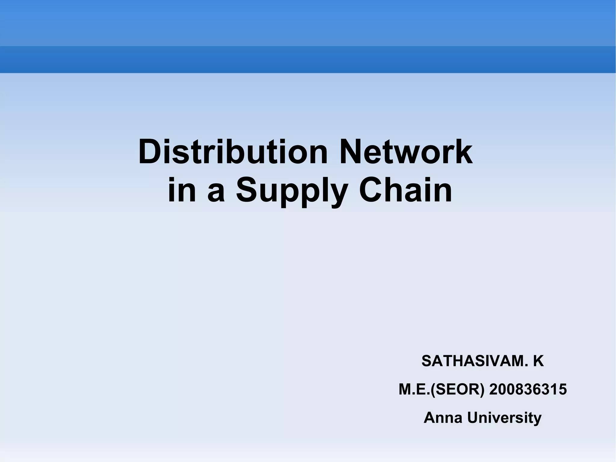 This document discusses distribution networks in supply chains. It outlines different design options for distribution networks, including manufacturer storage with direct shipping, distributor storage with carrier delivery, and retailer storage with customer pickup. Each design option has different impacts on costs, inventory levels, transportation, facilities, response times, product variety, and availability. The role of distributors is also discussed, noting how they can lower transportation and inventory costs while improving response times and providing one-stop shopping.