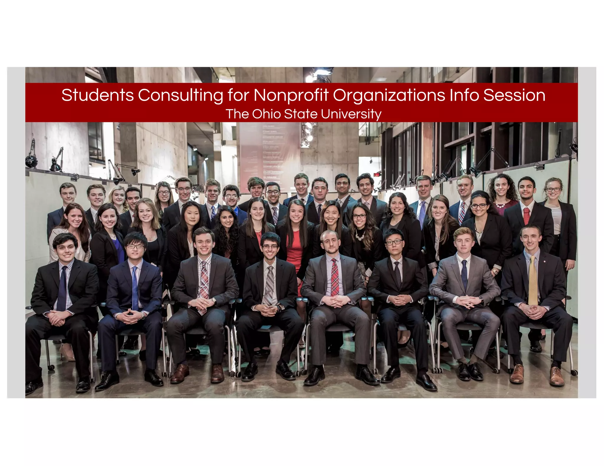 This document summarizes an info session for Students Consulting for Nonprofit Organizations at Ohio State University. It discusses that the organization provides consulting services to over 600 Central Ohio nonprofits, has approximately 50 members from diverse majors who take on 9-10 client projects each semester. It highlights the organization's accomplishments including winning the Fisher College of Business Best Application of Business Skills award for 5 consecutive years, and hosting a national conference for nonprofit consulting organizations. The presentation encourages interested students to apply by submitting a resume, attending an info session, and applying online.