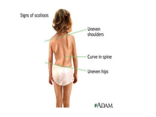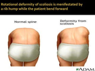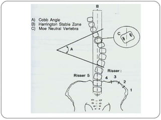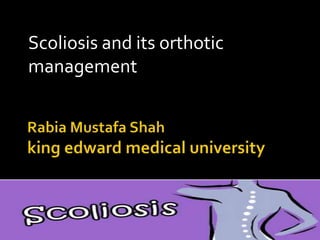 Scoliosis is a lateral curvature of the spine. It can be classified as mild (less than 20 degrees), moderate (20-40 degrees), or severe (over 40 degrees). Treatment depends on the severity and may include bracing or surgery. Common bracing options are the Milwaukee brace, TLSO brace, and Charleston night brace. The goals of bracing are to prevent curve progression in growing children and avoid the need for surgery.