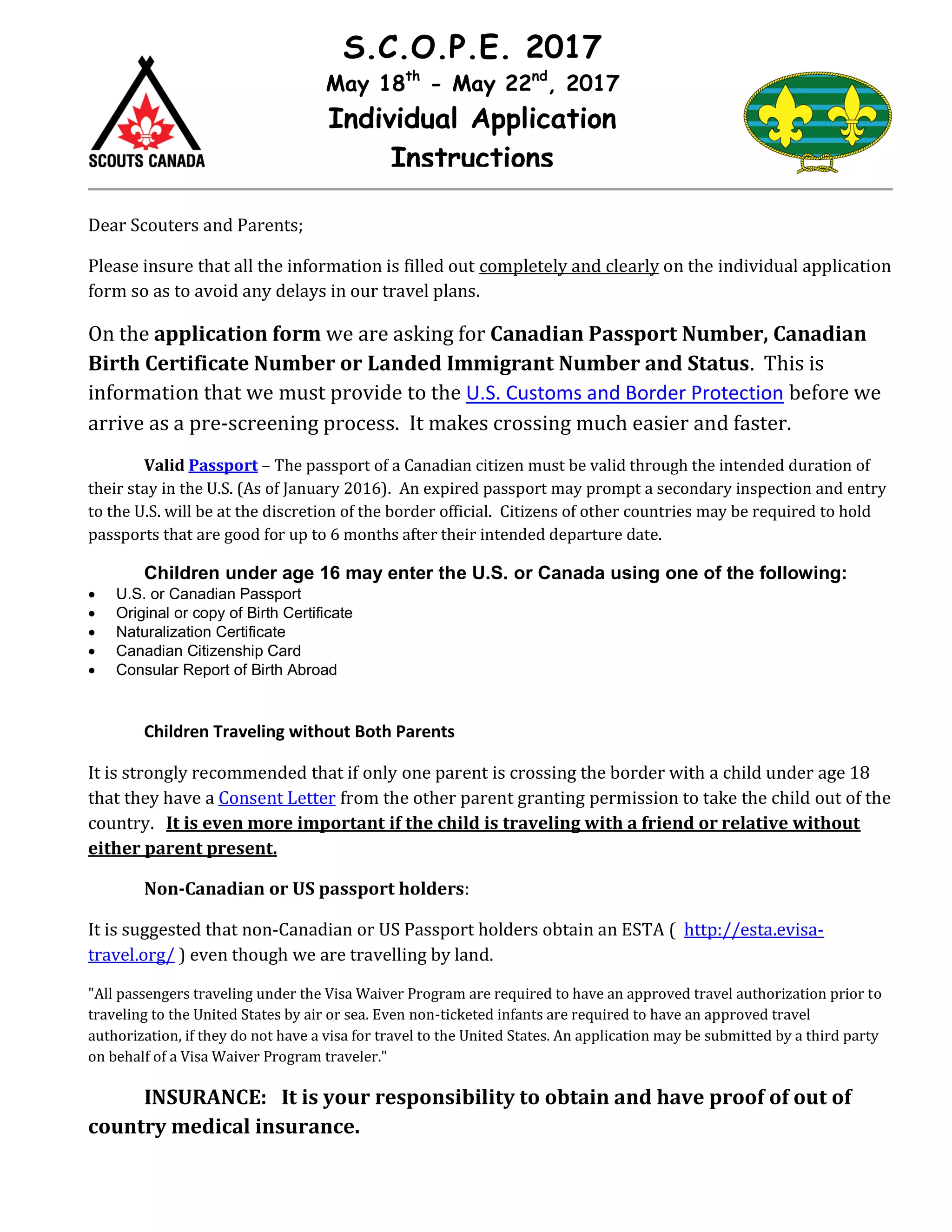 The document provides instructions for filling out an individual application form for a SCOPE trip taking place from May 18th to 22nd, 2017. It notes that all information must be filled out clearly to avoid delays, and specifically requests Canadian passport number, birth certificate number, or landed immigrant number and status, as this information must be provided to US Customs before arrival for pre-screening to make the border crossing easier. It also provides details on valid passport requirements for Canadian and other citizens, documentation needed for children under 16, consent letters if a child is traveling without both parents, and insurance requirements.