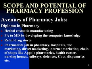 This document outlines the various career prospects and opportunities available to those with qualifications in pharmacy. It discusses avenues for jobs with a Diploma in Pharmacy, Bachelor in Pharmacy, and Master's/PhD in Pharmacy. Jobs are available in areas like the pharmaceutical industry, hospitals, retail pharmacies, teaching, and research. Opportunities exist in roles such as production, quality assurance, marketing, administration, and more. The document provides a detailed list of specific job titles and roles that pharmacy graduates can pursue both within India and abroad.