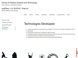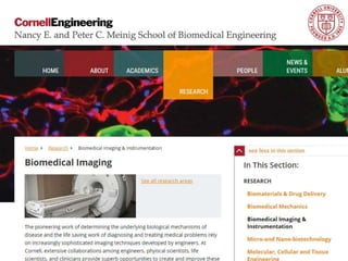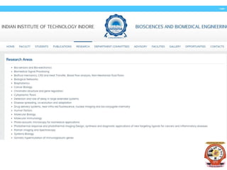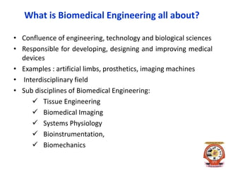 Biomedical engineering is an interdisciplinary field that applies engineering principles to medicine. It involves developing medical devices, imaging systems, prosthetics, and more to improve healthcare. In India, biomedical engineering degrees are offered at institutions like IITs, NITs, and private colleges. Masters and PhD programs are available mainly at IITs. Research areas include tissue engineering, biomechanics, imaging, and more. Biomedical engineers work in companies developing medical technologies and at research centers. The field has opportunities both in India and abroad.