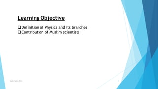 This document discusses the scope of physics, including its definition and main branches. Physics is defined as the science dealing with matter and energy interactions. The two main branches are classical physics, based on older theories like mechanics, electricity, sound, and heat, and modern physics, which deals with newer ideas like quantum physics, solid state physics, and nuclear physics. The document also outlines contributions of several important Muslim scientists to physics, including Ibn al-Haitham's work in optics, Al-Khwarizmi's development of algebra and the decimal system, and Dr. Abdus Salam's Nobel Prize-winning work in particle physics and grand unification theory.