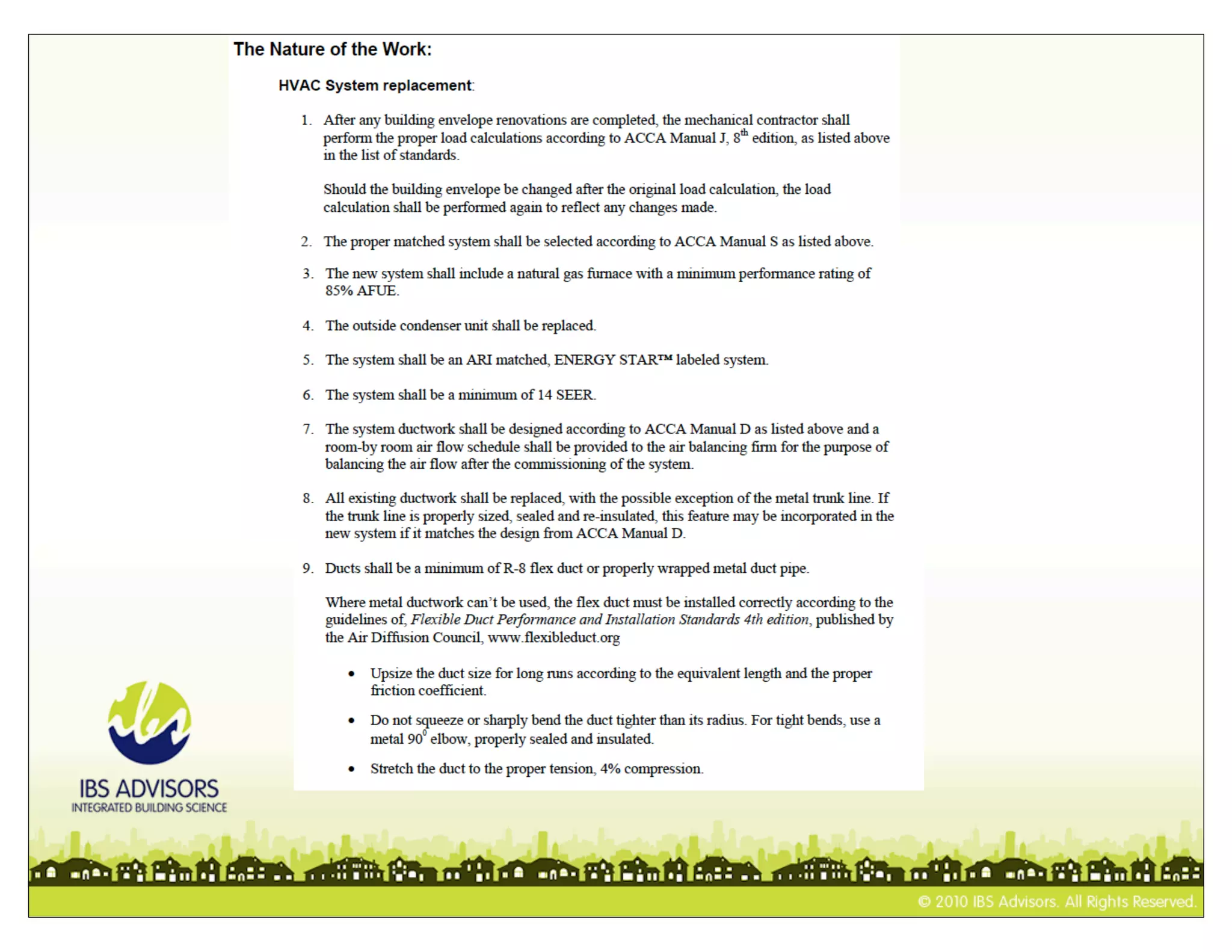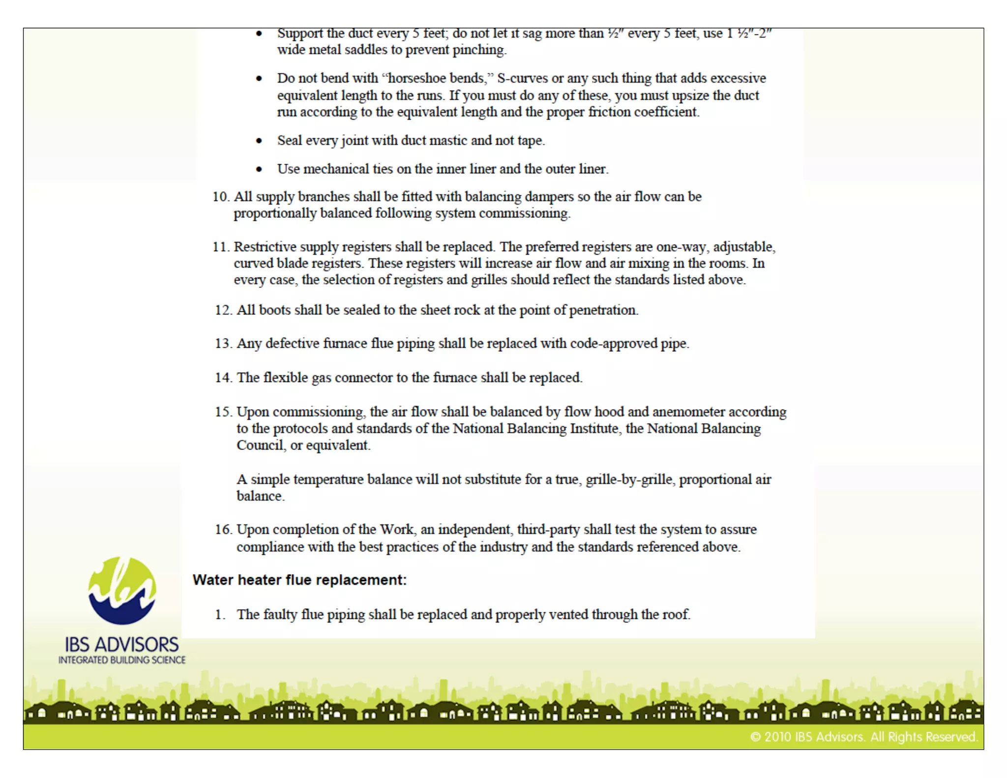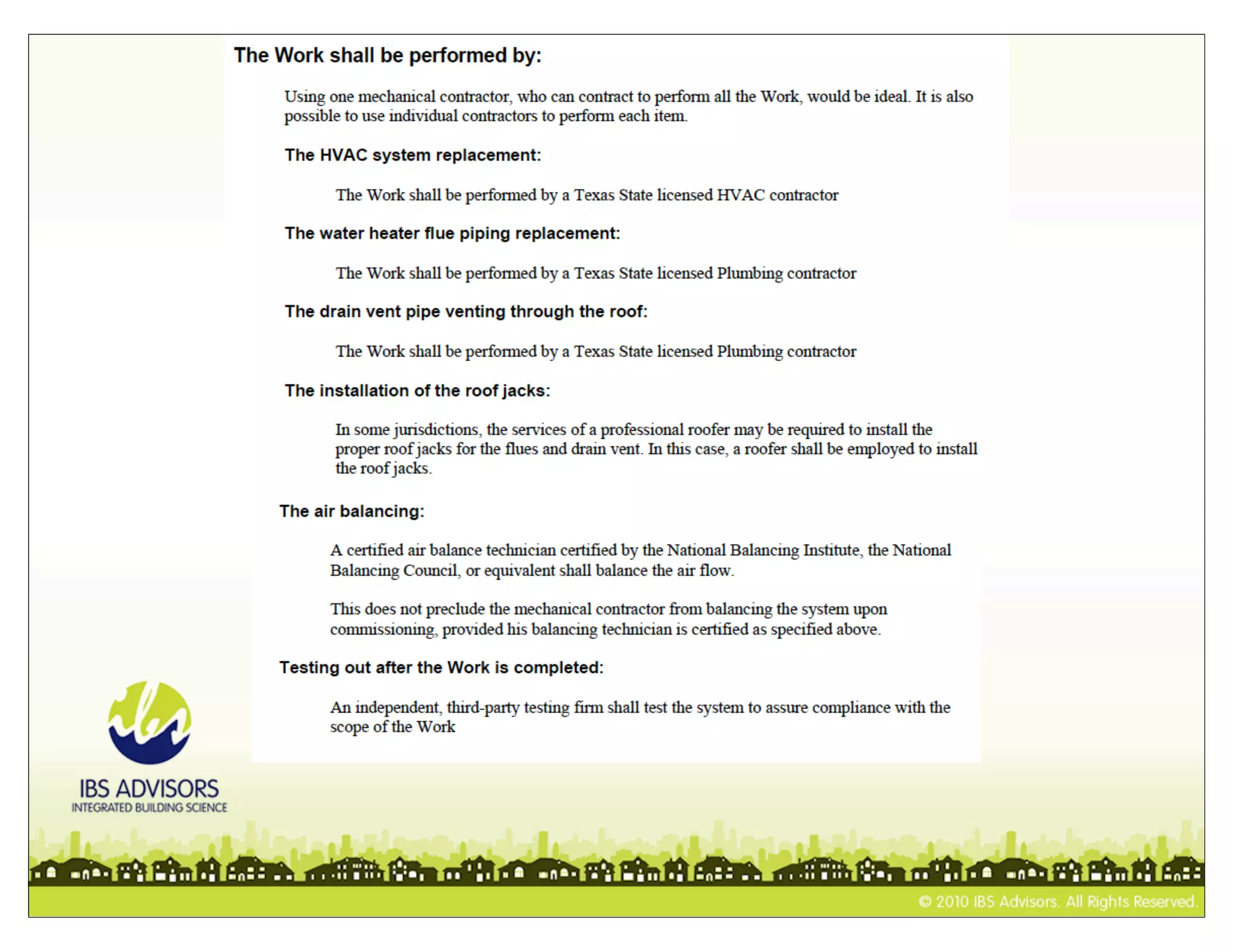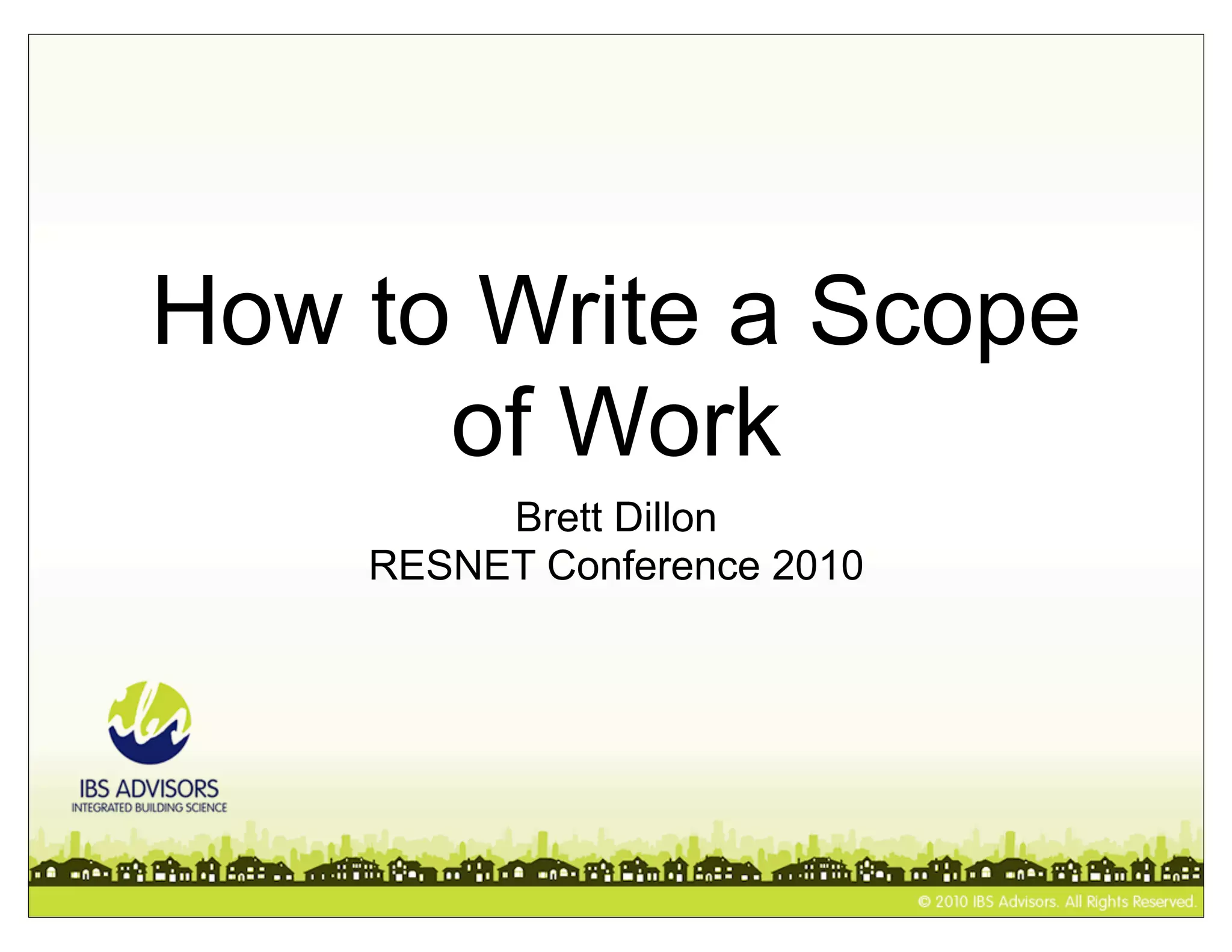 This document provides guidance on writing scopes of work for home energy improvements. It defines what a scope of work is and what it should describe. It also lists important standards and references that should be included or referenced in scopes of work. Specifically, it notes that scopes of work should describe proposed repairs, home performance improvements, prioritization, and estimated energy savings and cost effectiveness. It also warns that expertise is needed and lists moisture, exhaust fans, and other areas that scopes of work may need to address.