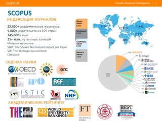Документ предоставляет обзор обновлений и функций платформы Scopus, включая метрики журналов, профили авторов и организаций, а также инструменты для анализа публикаций и цитирований. Он обсуждает использование разных метрик, таких как SNIP, SJR и CiteScore, для оценки научных исследований и поиска публикаций. Также представлены инструкции по исправлению ошибок в профилях и ответы на часто задаваемые вопросы пользователей.
