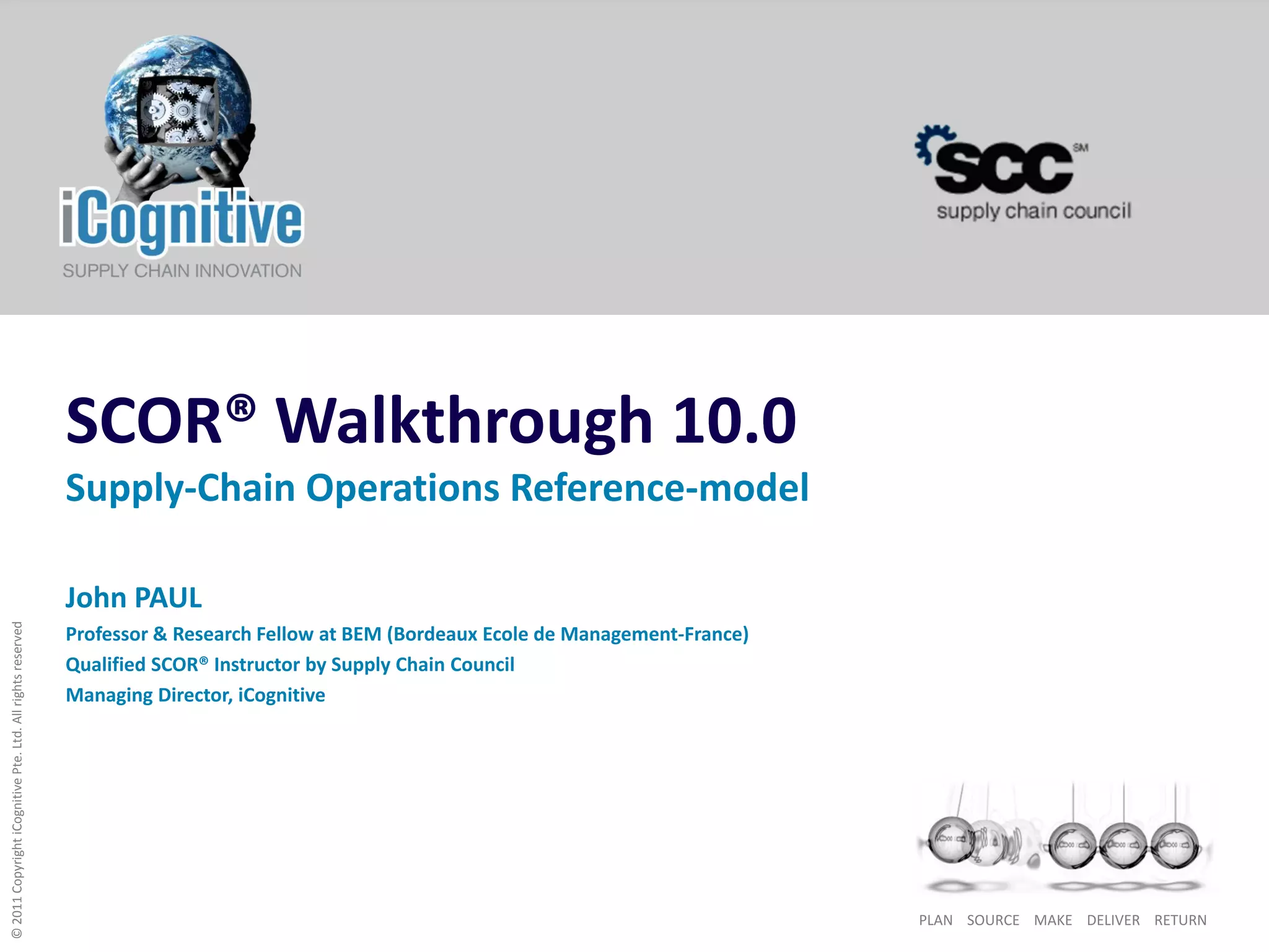The document provides an overview of the Supply Chain Operations Reference (SCOR) Model version 10.0, detailing its significance as a standard for supply chain management. It outlines the model's processes, metrics, best practices, and applications to enhance supply chain efficiency and effectiveness. Additionally, it discusses aspects of risk management and the importance of human capital in supply chain operations.