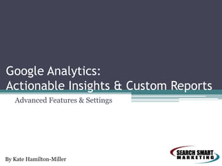 This document provides an overview of Google Analytics and how to use it to measure website traffic and marketing initiatives. It discusses setting up Google Analytics properly, understanding key terminology, and analyzing important reports to derive insights and take action. These reports include audience overview, traffic sources, popular content, visitor information, and goal conversions. It also covers more advanced features like conversion funnels, multi-channel attribution, mobile analytics, social media tracking, and real-time event monitoring. The overall message is that Google Analytics can provide actionable data to optimize marketing efforts if set up correctly and reports are interpreted properly.