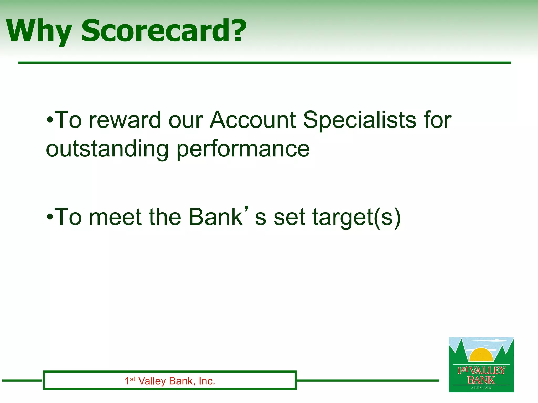 The document presents the implementation of a 'scorecard' incentive system at 1st Valley Bank for account specialists in microfinance, aimed at rewarding outstanding performance and meeting bank targets. It outlines the structure of the scorecard, including defined indicators and how it has fostered competition and improved documentation of employee performance since its introduction in 2003. The results demonstrate significant growth in key metrics such as loan disbursement and number of clients, while also serving as a model for performance management across other loan products.
