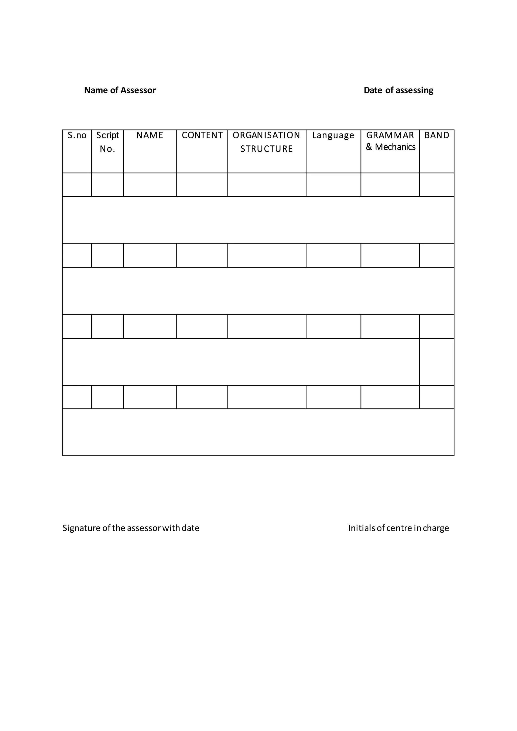 This document appears to be a rubric or assessment form used to evaluate writing samples or scripts. It includes spaces to note the script number, name of the person being assessed, and ratings for content, organization, structure, language, grammar and mechanics. The assessor and center in charge would sign and date the completed form along with initials once the assessment is finished.