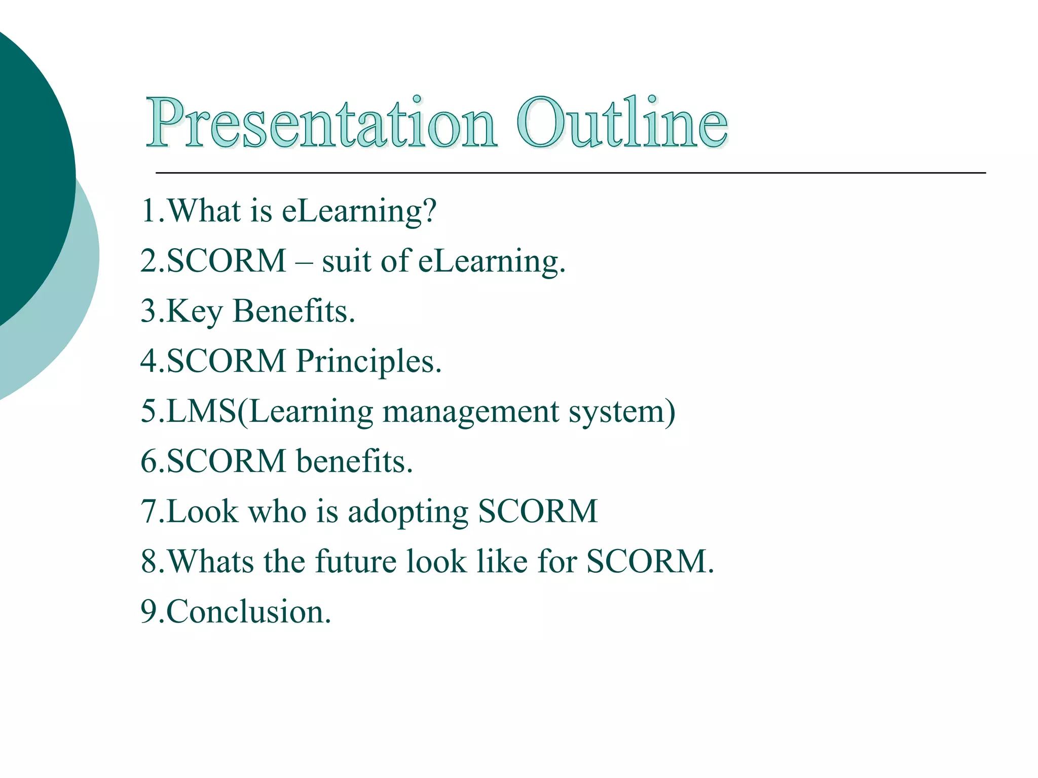 SCORM is a collection of standards and specifications that provide interoperability, accessibility and reusability of web-based learning content. It allows learning content to be shared, scaled and reused across different learning management systems (LMS). Some key benefits of SCORM include enabling the development of adaptive learning experiences and making content discoverable through repositories. Many organizations have adopted SCORM, including the US Department of Defense, other government agencies, large companies, and international bodies. The future of SCORM involves opening its maintenance to an international consortium and moving it beyond the Department of Defense.