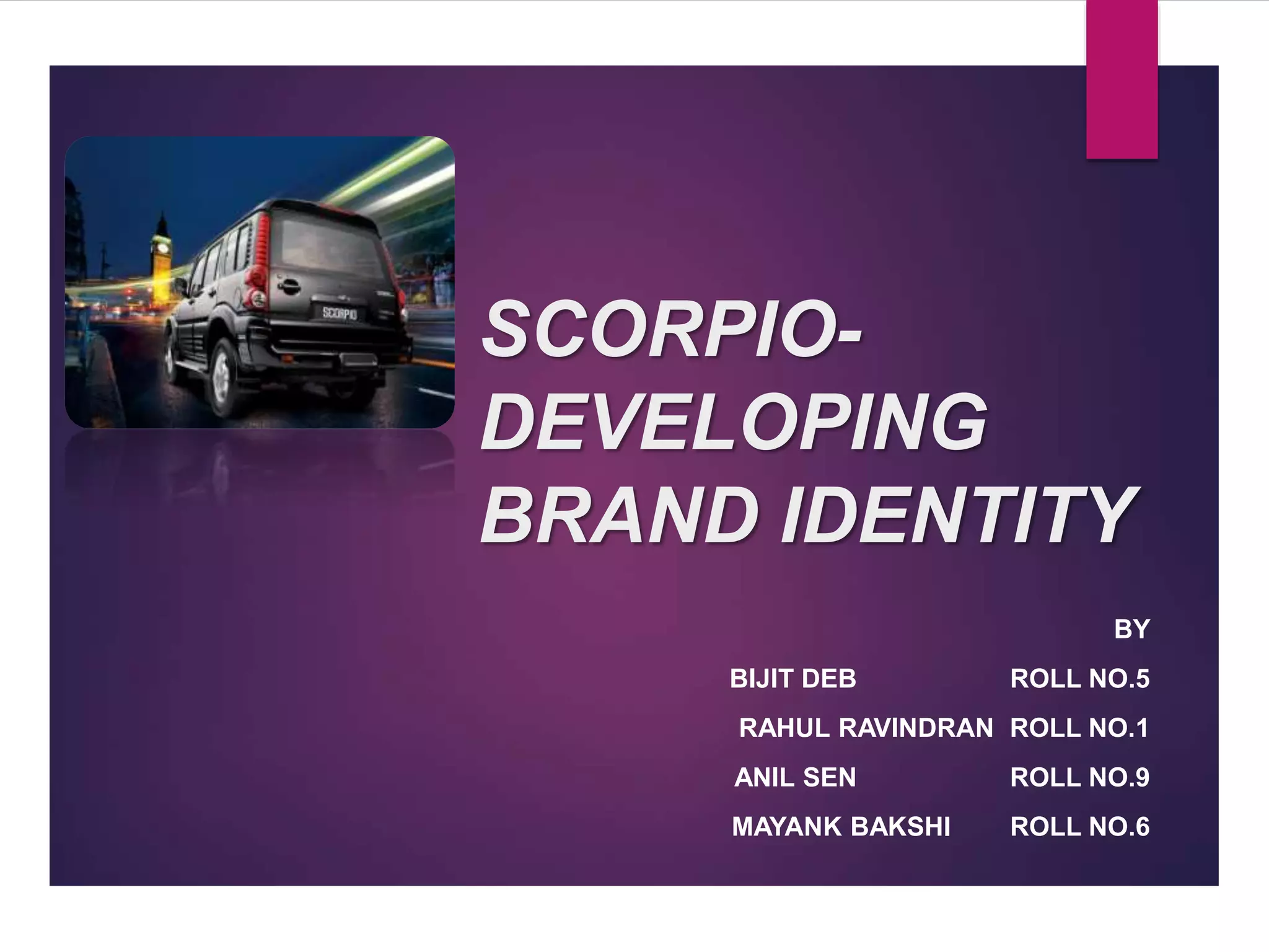 The document discusses the development of the brand identity for Scorpio, an SUV developed by Mahindra. It covers key concepts in brand management like defining a brand, building a brand identity through elements like name, logo, and positioning. For Scorpio, Mahindra conducted research to position it as a "car-plus" that offers more space, comfort and power than a regular car. They launched it nationally in phases and supported it with advertising, retail showrooms, and customer relationship programs. Over time, Mahindra shifted the positioning of Scorpio to be more off-road focused as consumer tastes changed.