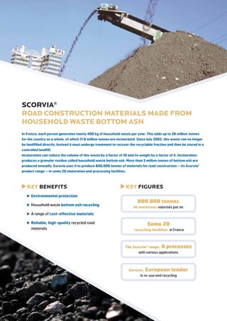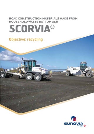 The document discusses the recycling of household waste bottom ash into road construction materials, specifically the scorvia® product range produced by Eurovia in France. Annually, over 800,000 tonnes of this ash are transformed into eco-friendly materials used for various road applications, supported by reliable industrial techniques. Stringent classification and application guidelines ensure environmentally responsible use of these materials in road construction.