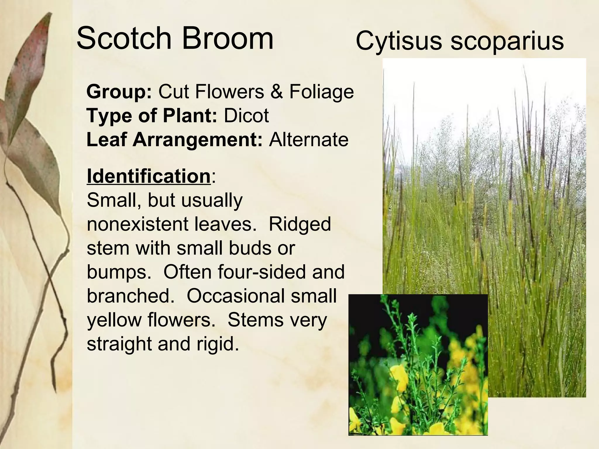Scotch broom is a dicot plant used for cut flowers and foliage. It has small or nonexistent leaves, ridged four-sided stems with buds, and occasional small yellow flowers. Good scotch broom for arrangements has long straight stems without disease or damage that last a long time wet or dry. While cultivated for its flowers, scotch broom has escaped and become a noxious weed in the Pacific Northwest.
