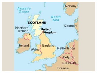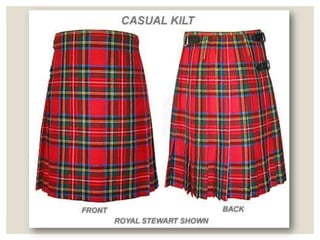 Scotland's symbol is the saltire, or Saint Andrew's Cross. Its climate is cool and wet. The main languages are English, Scots, and Scottish Gaelic. Traditional dress includes kilts and tartan patterns. Bagpipes are the iconic musical instrument. Tourism is an important part of the economy, with destinations including Glasgow, Edinburgh, Aberdeen, and historic sites like Melrose Abbey.