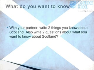 The document discusses the key aspects of Scotland, including its population, size, currency, and capital. It highlights Scotland's natural beauty, cultural elements like language and food, and its significance in sports, especially football and rugby. Additionally, it covers the upcoming independence referendum set for September 18, 2014, where voters will decide if Scotland should become an independent country.