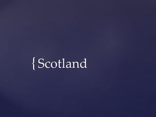 Scotland is a country that is part of the United Kingdom located in northern Great Britain. It has abundant streams, lakes, and rivers flowing into the North Sea and Atlantic Ocean, including Loch Ness which is known for reported sightings of the Loch Ness Monster. Edinburgh is the capital city located in southeast Scotland on the Firth of Forth coast. The Hebrides islands off Scotland's west coast have a diverse landscape and history of occupation by different cultures.