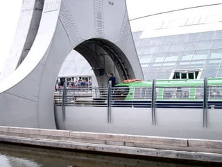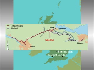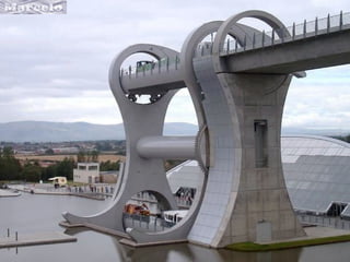 The Forth and Clyde Canal and Union Canal in Scotland were connected by 11 locks due to a 79ft elevation difference. In 1963 construction began on an extraordinary solution - a huge water carousel that was completed in 2002. This rotational boat transporter, the only one of its kind in the world, moves boats between the upper and lower canals using two rotating arms that act as tubs filled with water. The whole process takes just 15 minutes.