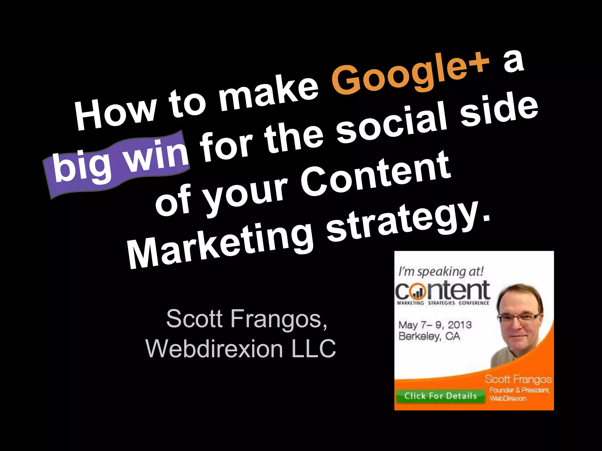The document outlines strategies and tactics for using Google+ as a content marketing tool, highlighting its benefits for SEO, user engagement, and branding. It emphasizes exercises for creating circles of influence and tracking performance metrics, along with practical applications of Google+ for business promotions and content curation. Additionally, it provides resources and case studies to illustrate successful implementations of these strategies.