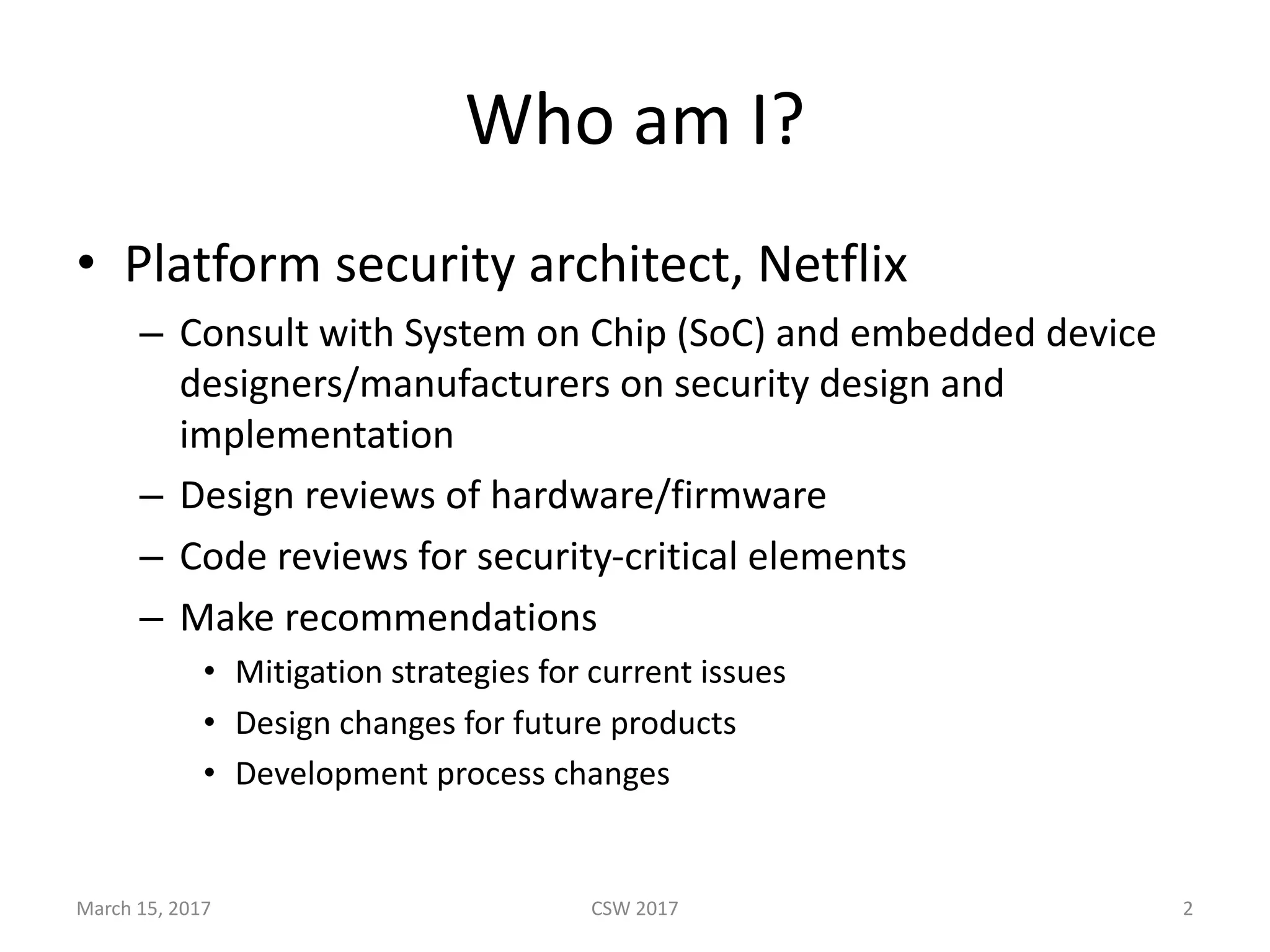This document summarizes Scott G. Kelly's presentation on secure boot flaws in IoT and embedded systems. Kelly discusses how secure boot is intended to work by only allowing authorized firmware to run, but that many systems implement it incorrectly. Common flaws include using symmetric keys that can be extracted from devices, having an "optional" secure boot that can be easily disabled, and having a weak root of trust if the first code executed is stored in unprotected flash. Kelly urges vendors to properly implement secure boot to prevent malware from replacing firmware and compromising systems.