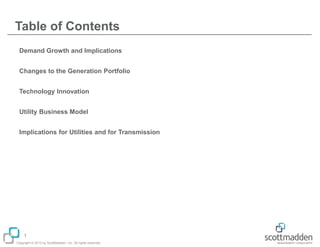 The document discusses the evolving landscape of utilities and electricity demand in the U.S., projecting minimal growth in electricity use and highlighting significant coal plant retirements due to regulatory pressures. It emphasizes innovation in technology, the impact of distributed energy resources, and trends in renewable energy, including wind and solar developments. The implications for utility business models are examined as increased reliance on decentralized generation forces utilities to adapt to changing customer demands and regulatory environments.