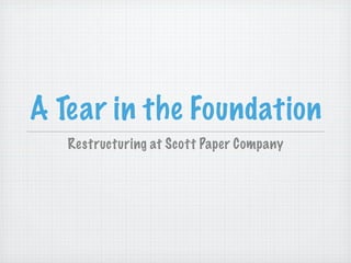 The document discusses a restructuring plan for Scott Paper Company. It identifies key issues to address, including which assets to sell or grow, employee layoffs, and the plan's impact on share prices. The analysis considers alternatives like selling the forestry or S.D. Warren divisions. It is recommended to sell the forestry division as integration has not benefited earnings and it is the highest cost area. The restructure will be implemented over 3 years to focus on tissue and paper products and improve earnings and share prices.