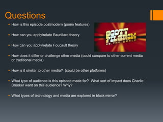 This document analyzes the film Scott Pilgrim vs The World through postmodern and media theory lenses. It discusses how the film uses postmodern features like hybridization and intertextuality by blending genres and incorporating references to other works. It applies the theories of Baudrillard and Foucault, noting how the film creates a hyperreality that blurs reality and simulation, and enhances voyeurism. While challenging other media through its unrealistic video game style, it is similar in its use of intertextual references and exploration of themes like gaining superpowers. The targeted niche audience must understand retro games and media to appreciate the references.