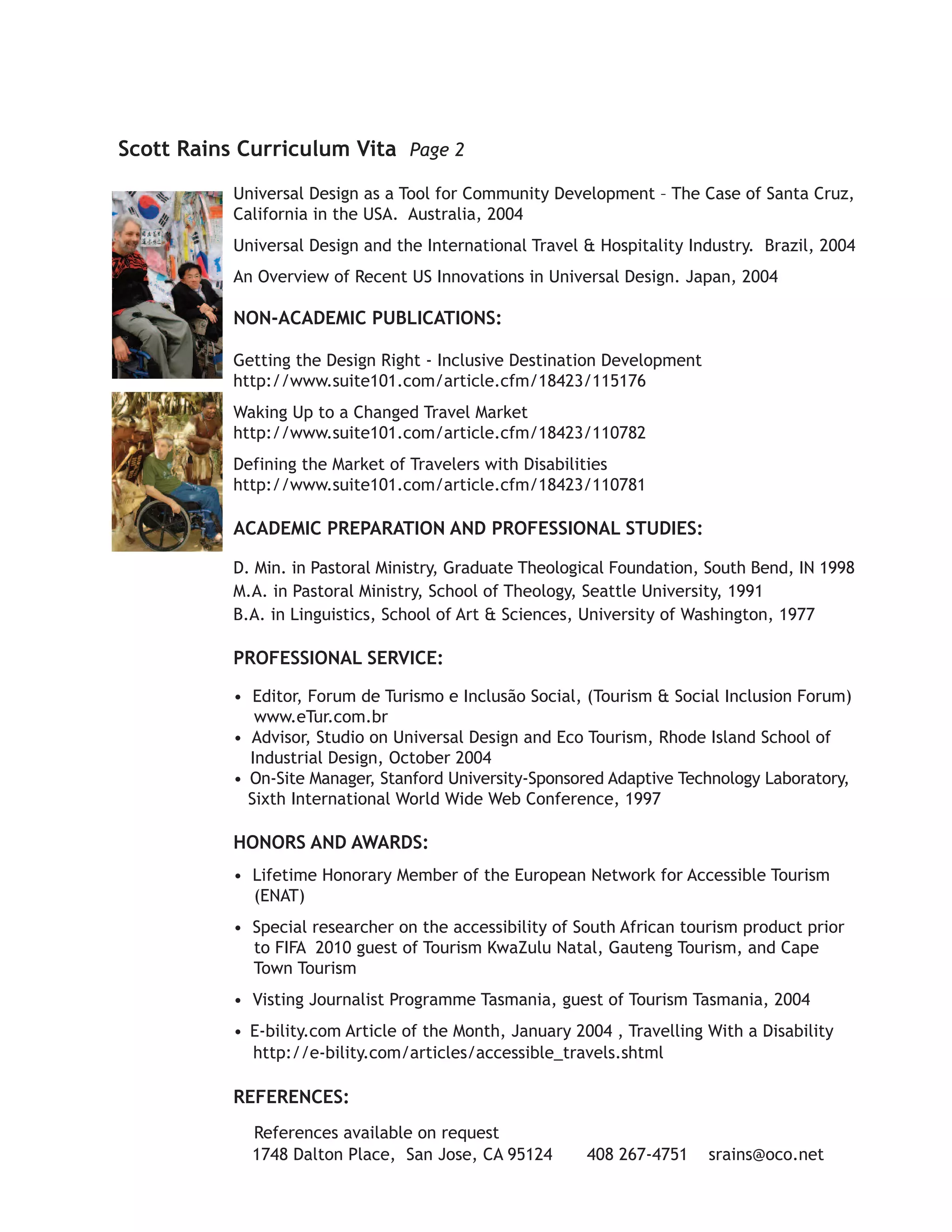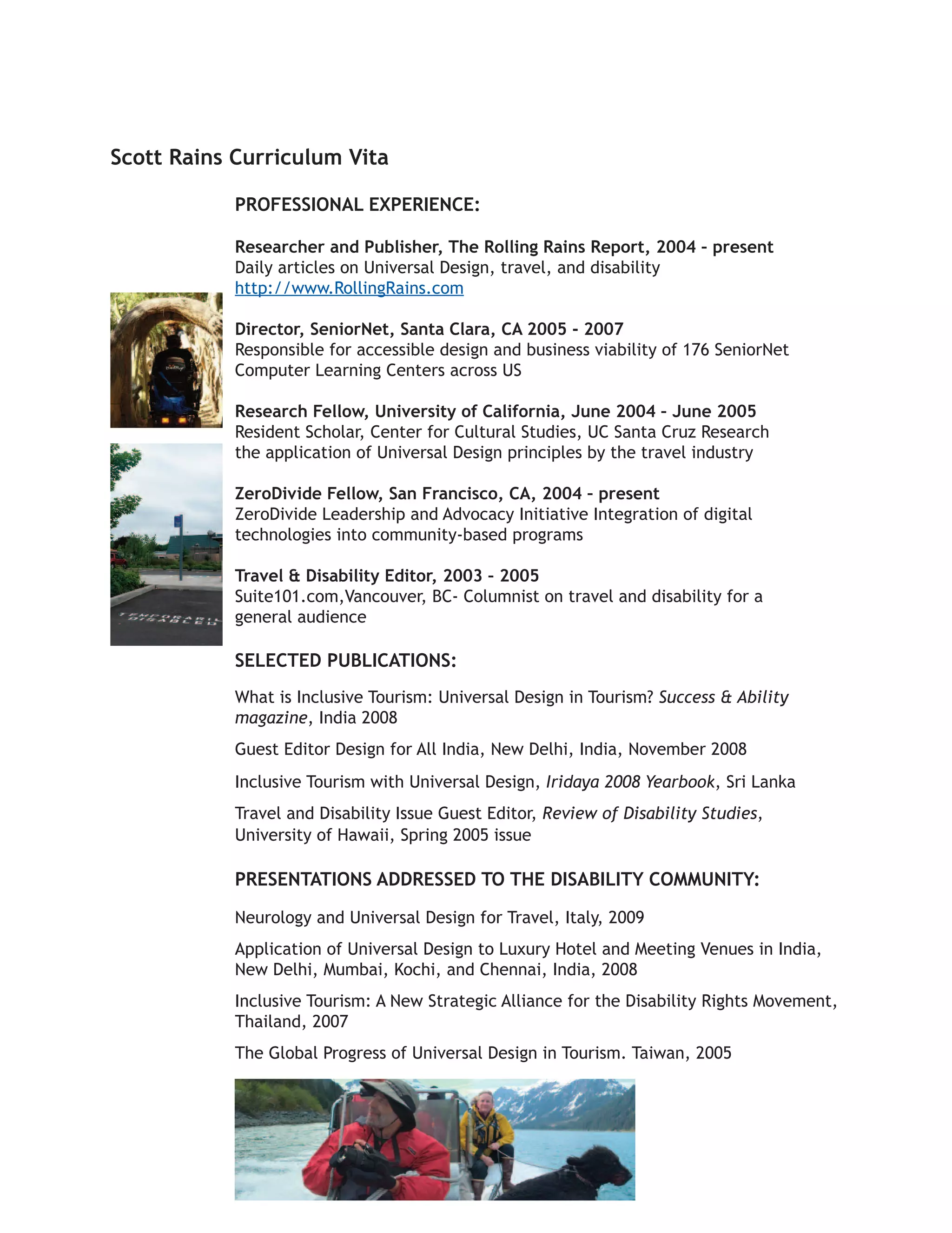 Scott Rains has extensive experience researching and advocating for universal design and accessibility in the travel industry. He has worked as a researcher, publisher, director, and fellow focusing on applying universal design principles. Some of his roles include directing SeniorNet, researching universal design at UC Santa Cruz, and being a fellow at ZeroDivide. He has published several articles and presentations on universal design and inclusive tourism. Rains has a D.Min in pastoral ministry and MA in pastoral ministry and has received honors for his work researching accessibility in South African tourism.