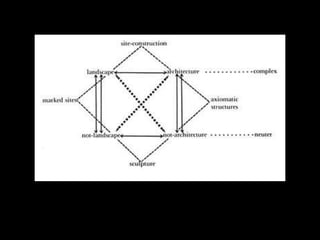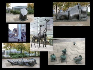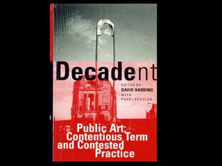 The document discusses the evolution of public art and its significance within a broader cultural context, highlighting various forms of public art and their societal impact. It examines artists' roles in public spaces, the critique of non-site-specific works, and initiatives like the Artist Placement Group aimed at integrating art within social and governmental frameworks. Additionally, it presents specific examples of public art projects and the intention behind their integration into urban environments.