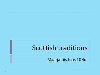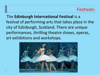 The document summarizes some key Scottish traditions and festivals. The Edinburgh International Festival features performing arts events annually. The Beltane Fire Festival is held each spring on Calton Hill and involves bonfires and performances. St. Andrew's Day on November 30th celebrates Scotland's patron saint and features widespread display of Scottish flags. Easter was traditionally marked with large fires on Easter Saturday in many parts of Scotland.