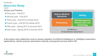 The document summarizes findings from a benchmarking study of HR shared services conducted by ScottMadden and APQC. It highlights metrics related to staffing models, service delivery, technology adoption, and intelligent automation usage. Top performers tended to be more mature organizations serving more employees across fewer centers using specialized staffing and self-service technologies. The study involved 46 metrics and 29 questions across various industries.