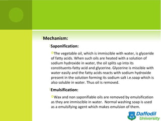 Scouring is the process of removing natural and added impurities from textiles using alkali solutions. The main objectives of scouring are to make the fabric hydrophilic, remove oils, waxes and other impurities, increase absorbency, and prepare the fabric for downstream processing. Scouring works through saponification of oils and emulsification of waxes. The scouring process depends on factors like fiber type, fabric construction and intended dyeing process. Common scouring methods include batch processing in kiers or continuous processing in jigs or boxes. Souring involves treating the scoured fabric with acid to neutralize residual alkali.