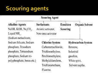 Scouring is a process that removes natural and added impurities from textiles through the use of chemicals like alkalis and surfactants. It saponifies fats and waxes, breaks down proteins and pectins, and increases the textile's absorptive capacity. The type of scouring agent used depends on the fiber and extent of impurities. Scouring emulsifies and saponifies impurities to solubilize and suspend them for removal, improving dyeability and finish performance.