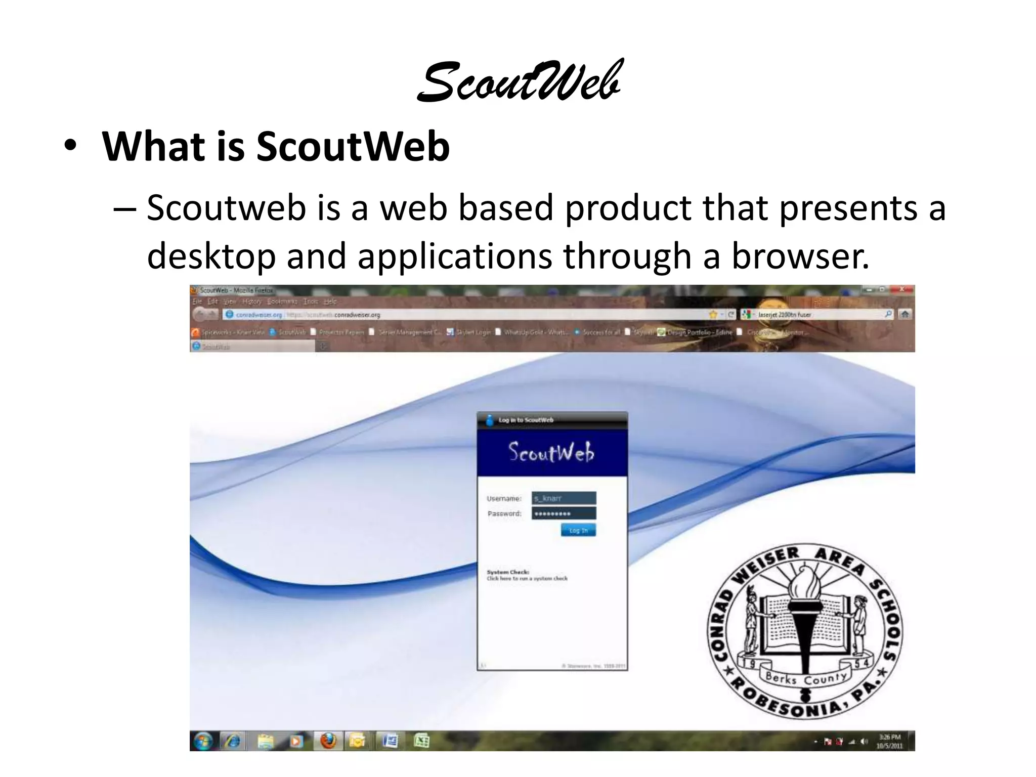 ScoutWeb is a web-based product that allows users to access files, applications, forums, blogs, and news from any device through a browser. It presents a desktop interface for Word, Excel, PowerPoint, Publisher and provides access to a user's P and W drives. To use ScoutWeb, open a browser and go to scoutweb.conradweiser.org, perform a system check, then login with your usual network credentials to see the web desktop. You can open and edit files by double clicking them and must close applications when finished.