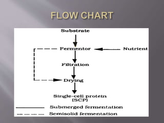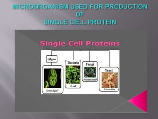 Single cell protein (SCP) refers to edible microorganisms or their extracts used as a protein supplement. SCP can be produced using bacteria, yeast, fungi or algae through fermentation. It has high nutritional value but also has some limitations. Research is focused on improving production methods and addressing issues like high nucleic acid content and digestibility. SCP shows potential as a sustainable protein source but more work is needed before it will be widely accepted as human food.