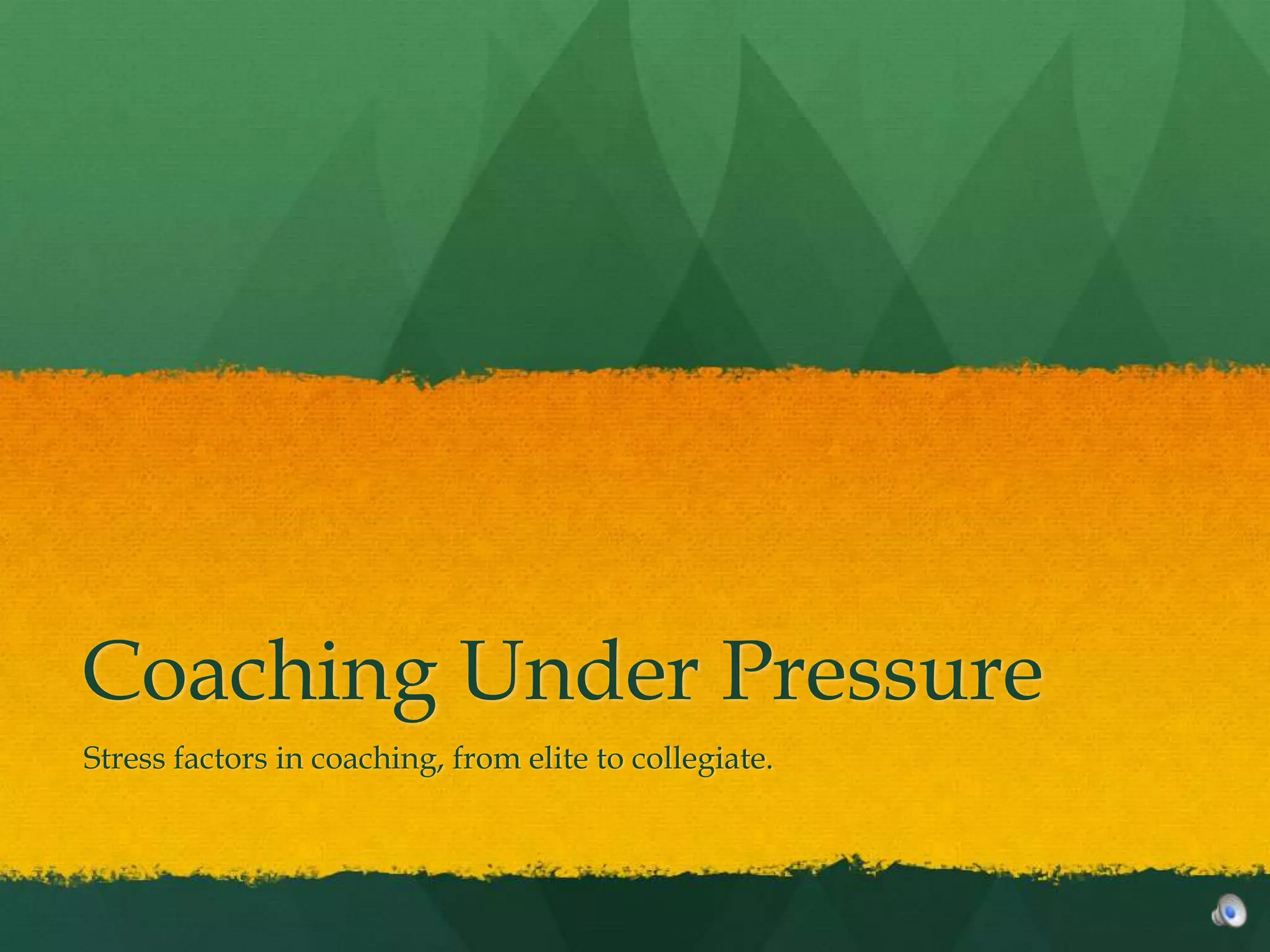 Coaching is a stressful profession that can lead to burnout. Stressors for coaches include expectations and pressure to win, athlete concerns, long hours, and lack of support. Around 35% of coaches in USA Swimming stop coaching each year due to burnout. Coping strategies like emotion management and problem solving can help coaches deal with stressors. Education on coping strategies may help reduce burnout by providing coaches with the proper tools to manage stress. Support for coaches and developing stress management techniques are important for preventing coaching burnout.