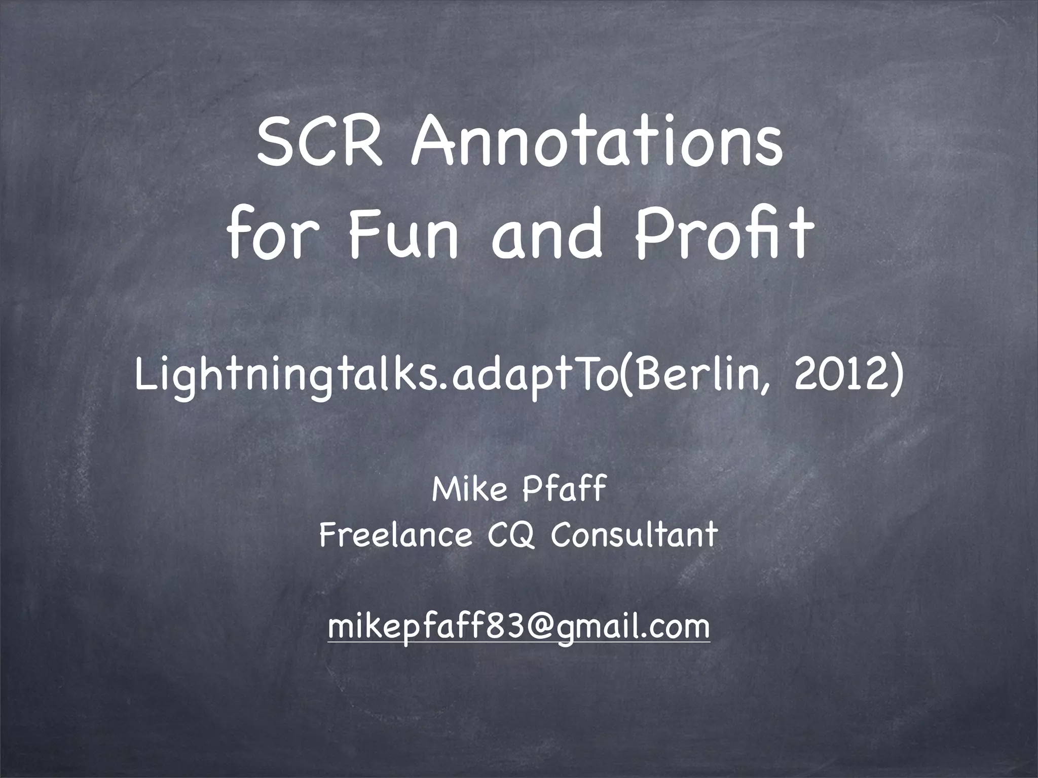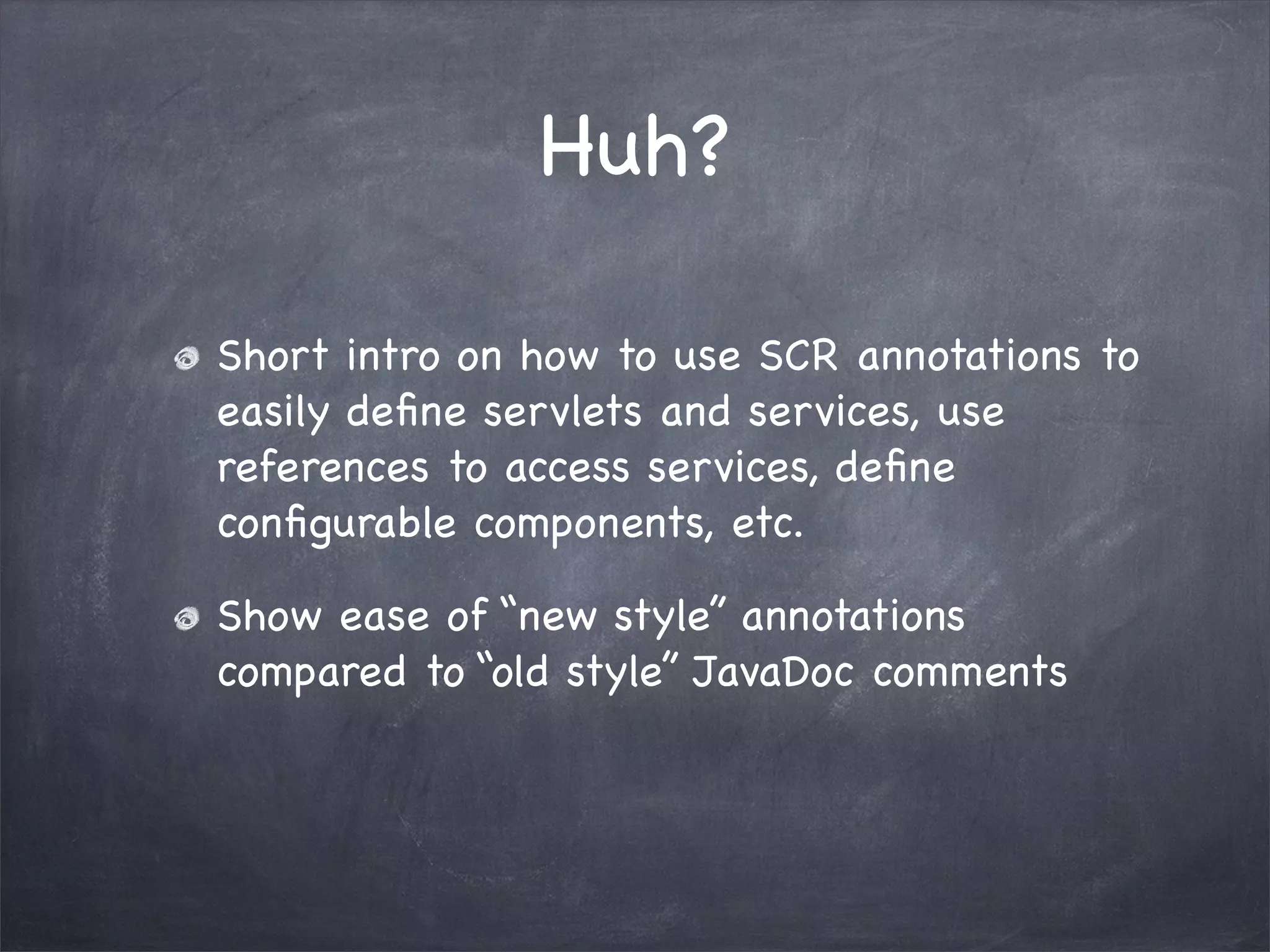 This document discusses using SCR annotations as an alternative to JavaDoc comments for defining OSGi services, references, and components. It provides examples of using annotations to define servlets, references, and configurable components. It also covers using the Apache Felix maven plugin and some best practices like only setting "metatype" to true if the component needs to be configurable.