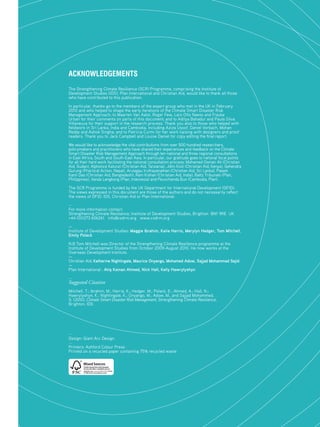 This document presents a new approach called Climate Smart Disaster Risk Management (CSDRM). It is the result of input from over 500 practitioners working in disaster risk management and climate change adaptation across Africa and Asia. The CSDRM approach identifies 12 components organized under three pillars: 1) tackle changing disaster risks and uncertainties, 2) enhance adaptive capacity, and 3) address poverty and vulnerability. The approach was developed through field research examining projects in locations such as the Mekong River region, Orissa state in India, and Sri Lanka. It was further validated through extensive consultations with national stakeholders in 10 countries. The document concludes that successful implementation of CSDRM requires investment in collaboration, partnerships, technical capacity building, and creating