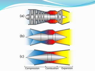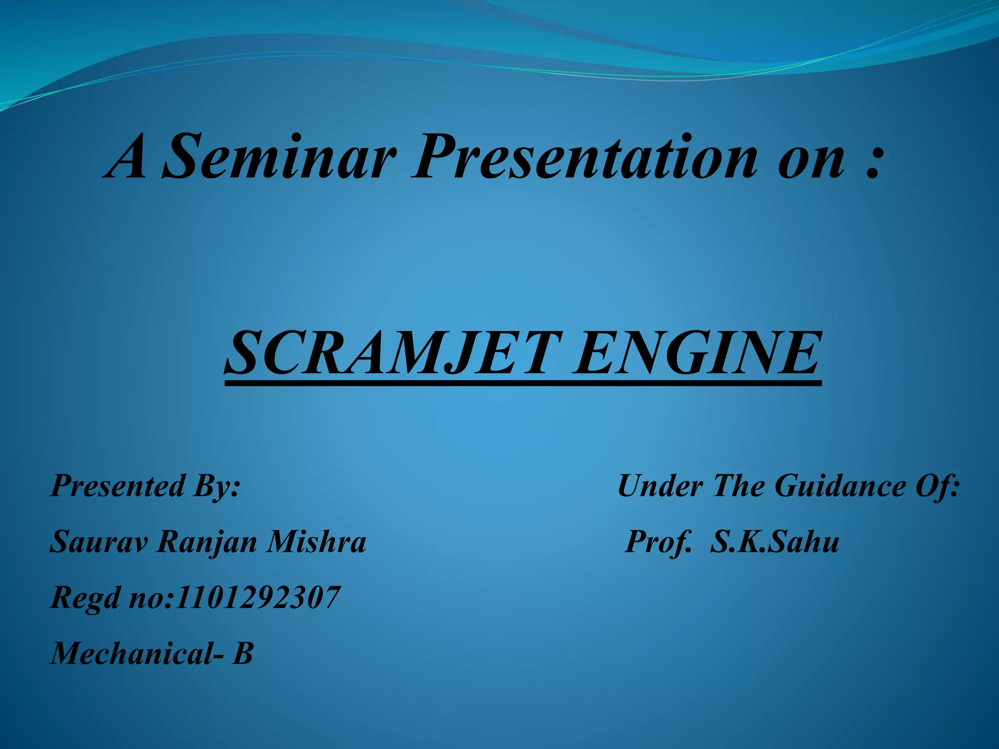 The document presents information about scramjet engines. It discusses the history of scramjet development from World War II to recent test flights reaching Mach 10 speeds. The key components of a scramjet engine are described as a converging inlet to compress incoming air, a combustor where fuel is burned, and a diverging nozzle to accelerate the heated air and produce thrust. Scramjets differ from other jet engines by not using rotating components for compression and relying on high flight speeds to compress air before combustion. Potential applications include hypersonic aircraft that could reduce intercontinental flight times to under 90 minutes.