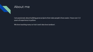 The document discusses web scraping and provides an overview of the topic. It introduces the author and their experience before providing a brief history of web scraping, noting it involves extracting data from websites using automated processes. The document then mentions HTML, CSS, and frameworks like Beautiful Soup and Scrapy that can be used for web scraping. It emphasizes choosing the right tools and experimenting to get started with web scraping.