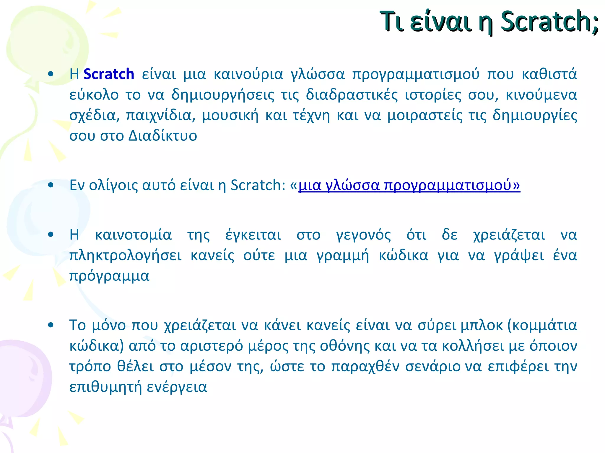 Τι είναι η Scratch ; Η Scratch είναι μια καινούρια γλώσσα προγραμματισμού που καθιστά εύκολο το να δημιουργήσεις τις διαδραστικές ιστορίες σου, κινούμενα σχέδια, παιχνίδια, μουσική και τέχνη και να μοιραστείς τις δημιουργίες σου στο Διαδίκτυο Εν ολίγοις αυτό είναι η Scratch: « μια γλώσσα προγραμματισμού » Η καινοτομία της έγκειται στο γεγονός ότι δε χρειάζεται να πληκτρολογήσει κανείς ούτε μια γραμμή κώδικα για να γράψει ένα πρόγραμμα Το μόνο που χρειάζεται να κάνει κανείς είναι να σύρει μπλοκ (κομμάτια κώδικα) από το αριστερό μέρος της οθόνης και να τα κολλήσει με όποιον τρόπο θέλει στο μέσον της, ώστε το παραχθέν σενάριο να επιφέρει την επιθυμητή ενέργεια