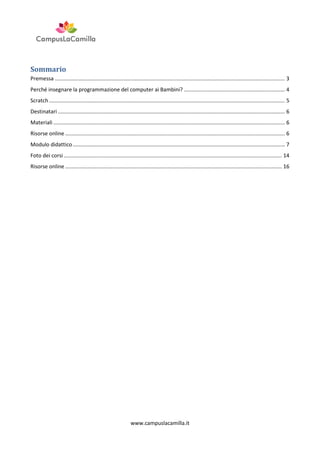 Il documento presenta un modulo didattico per insegnare la programmazione ai bambini attraverso Scratch, evidenziando l'importanza di formare giovani in grado di interagire attivamente con la tecnologia. I corsi, destinati a bambini tra i 6 e i 14 anni, utilizzano un approccio pratico per sviluppare competenze tecniche e creative, con particolare attenzione alla programmazione visuale. Inoltre, viene sottolineata la crescente necessità di programmatori nel mercato del lavoro futuro.