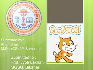 The document is a submission detailing Scratch, a free programming toolkit designed for children to create games and interactive stories. It outlines important aspects of Scratch, including its history, programming blocks, and basic functions like motion and sound. Scratch has gained popularity through initiatives like code clubs and is built on the Squeak environment developed at MIT Media Lab.