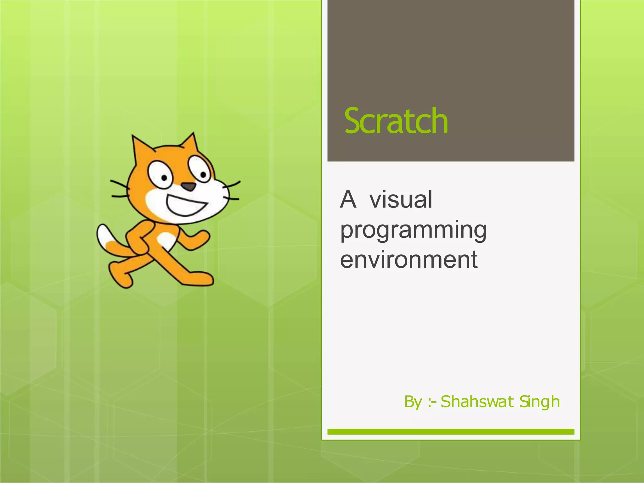 The document discusses the visual programming environment called Scratch. It provides an introduction to Scratch, describing its history starting in 2003 at MIT and objectives of making programming accessible and fun. It explains the major components of the Scratch interface and provides examples of the different types of blocks available for controlling things like motion, appearance, sound, pen, data, events, control structures and sensing. It concludes with proposing a simple program using Scratch that displays "hello world" when hovering over a sprite.