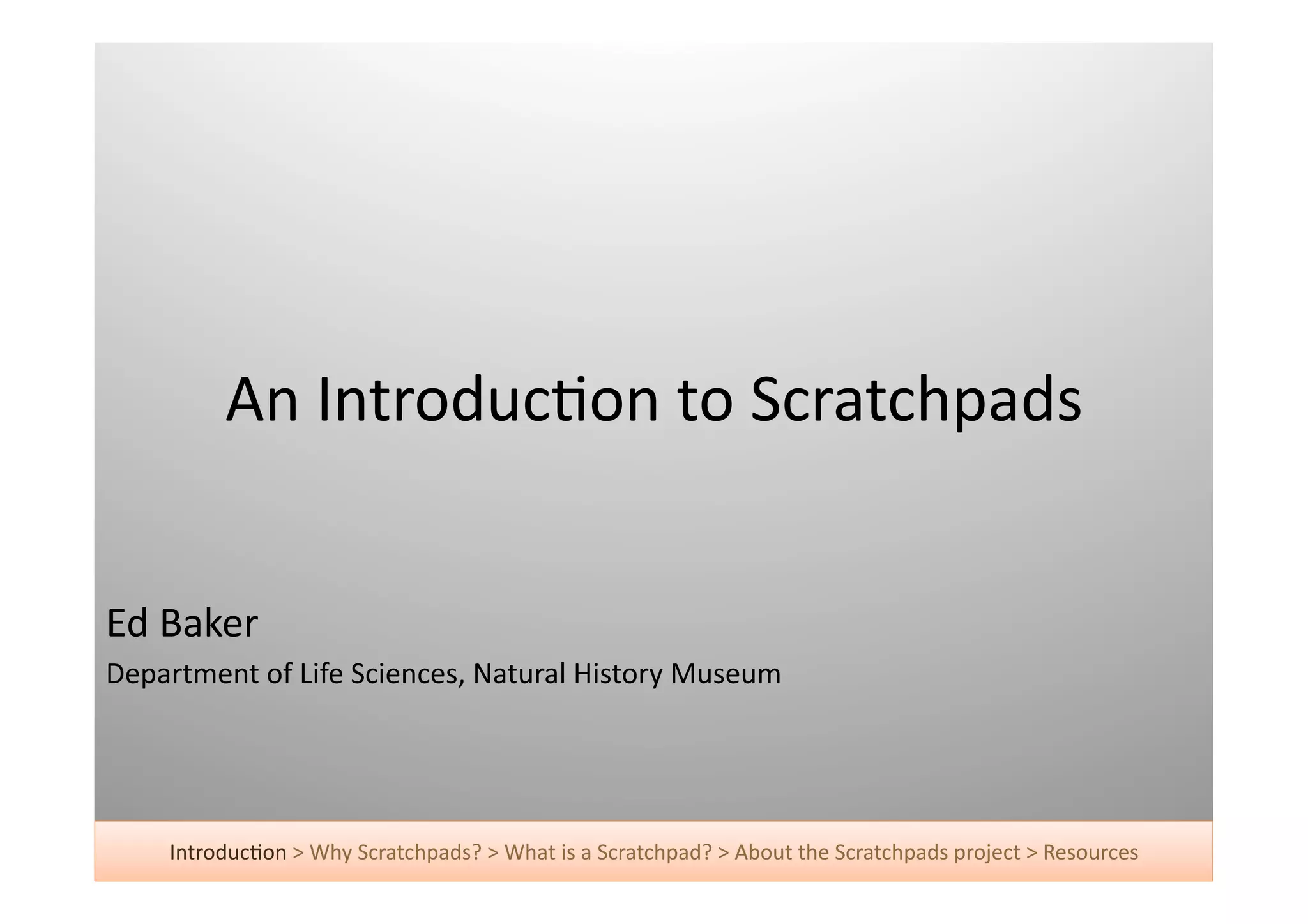 The document introduces scratchpads as open-access, online platforms for scientists to share biodiversity data. Scratchpads allow researchers to create taxon pages, distribution maps, bibliographies and more. They are hosted websites created by local scientists and supported by various European Commission grants. Scratchpads aim to make more scientific knowledge available globally by allowing updates, community contributions and integration with other data sources.