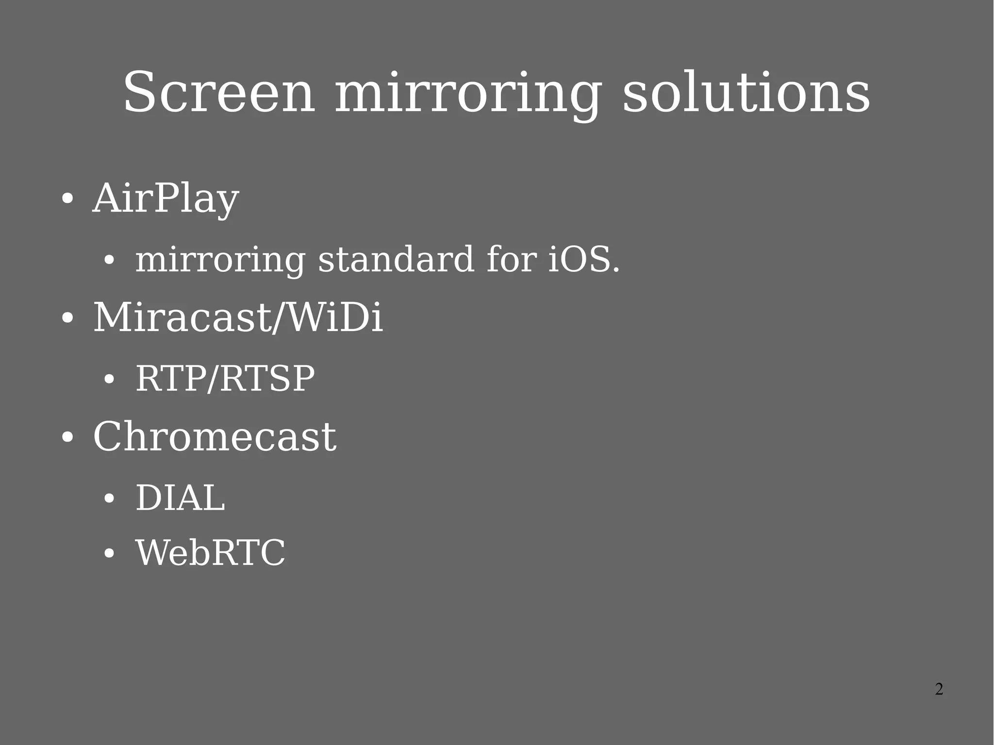 This document summarizes several wireless screen mirroring and streaming protocols including Apple AirPlay, Miracast/WiDi, Chromecast, and DIAL. It provides details on discovery methods, media protocols, codec and container support, commercial implementations, and software for creating Chromecast clones. Requirements for hacking AirPlay to remove DRM restrictions are also outlined.